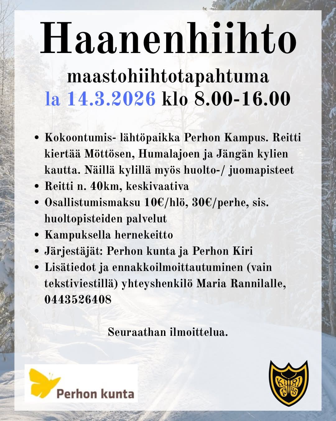Perhon kirin järjestämä Haanenhiihto siirretään heikon lumitilanteen vuoksi lauantaille 14.3. Alkuperäinen päivä oli 28.2. Lisätietoja liitteenä olevasta mainoksesta. Katso liitteenä oleva tapahtuman mainos!!Liitteet