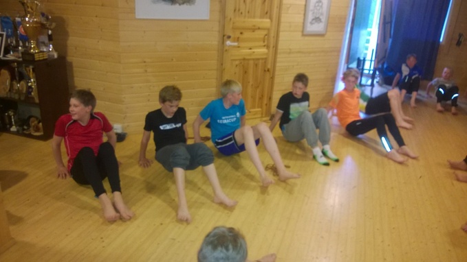 Teimme kolme sarjaa, joissa oli kaikissa kahdeksan liikettä. Esim: kyykyt, punnerrukset ja dipit. Sarjan osio kesti noin 30 minuuttia ja venyttelyt suunnilleen saman verran. Yhtä liikettä tehtiin yksi minuutti.