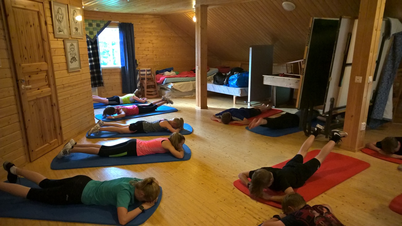 Leiri alkoi perjantaina lajivoimaharjoituksella. Rullatreeniin sisältyi mm. tasatyöntövetoja. Illan futispelit ja loikkaharjoitteet antoivat hyvän valmiuden seuraavaan aamun vaaran testijuoksuun.